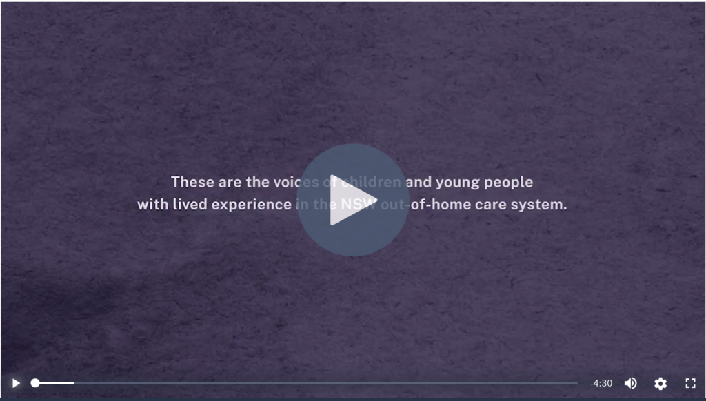 You can read the ACYP Out-of-Home Care report and watch a video that shares the voices of children and young people involved on their website: https://www.acyp.nsw.gov.au/out-of-home-care