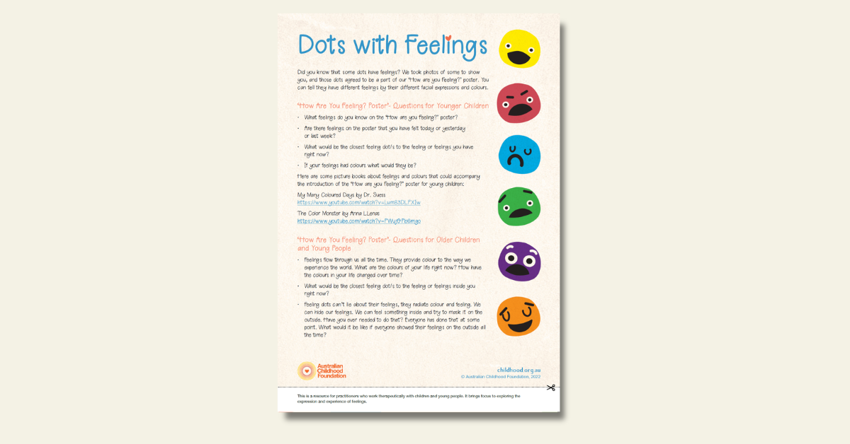 Dots with feelings is a therapeutic resource designed to help children and young people explore and express emotions through colour, facial expressions and guided conversation. Featuring playful “feeling dots” and accompanied by age-specific reflection questions and creative activity ideas, it supports practitioners to build emotional literacy, encourage storytelling, and create safe spaces for children to notice, name and make sense of their feelings.