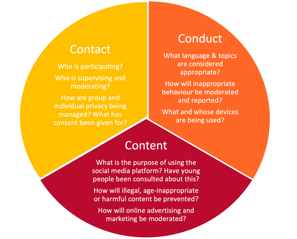 By identifying these risks, you can adjust your own practice and also guide the behaviour of others in your workplace to set positive examples of safe social media use with young people.