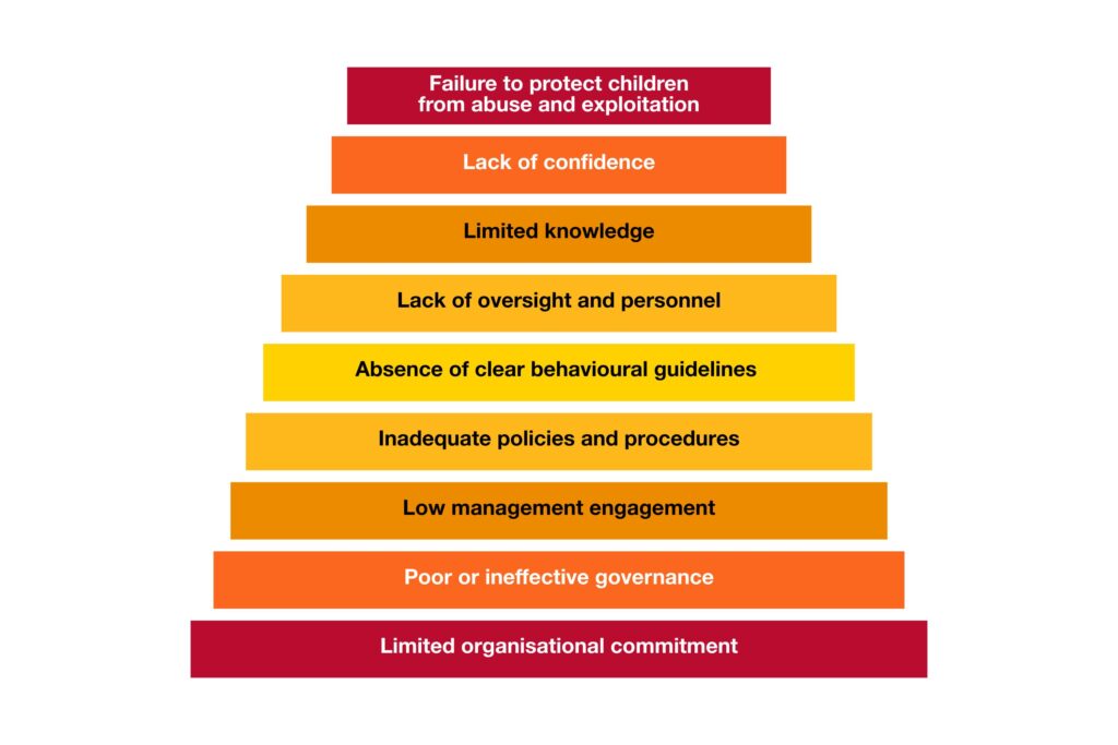 Failure to protect children starts with an ineffective organisational culture that is not resourced by the leadership of the organisation. Often effective governance structures and protocols are absent. Poor or not well-executed policies and procedures complicate and confuse decision making processes for staff, volunteers and service users. All of these factors lead to a lack of knowledge and a lack of confidence by staff to know how to respond to the risks that may occur in relation to children and young people.