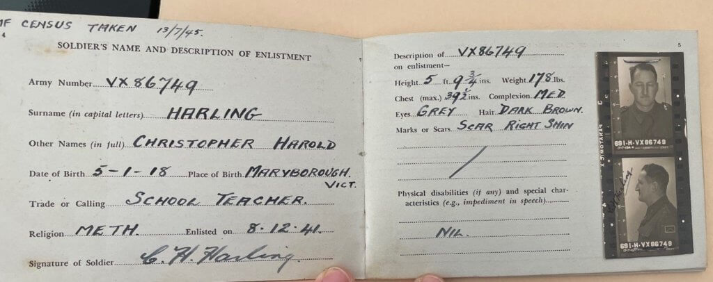 Pictured here are pages from my grandfather’s 1941 military service booklet that I found when cleaning up at Mum’s. Isn’t it strange to glimpse your grandparents as young people?
