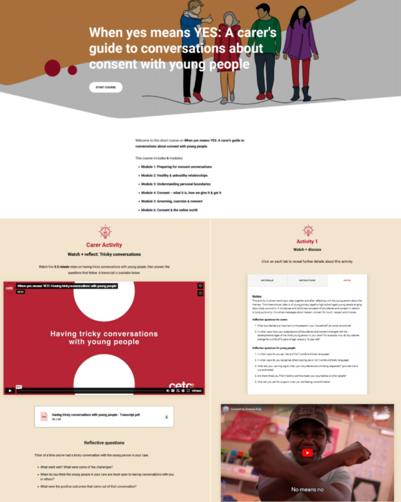 This six-module self-paced course covers preparation for trauma-informed discussions, grooming, online safety, healthy relationships, boundaries and consent. It features the living voices of carers, which was definitely a highlight for carers who piloted the course.