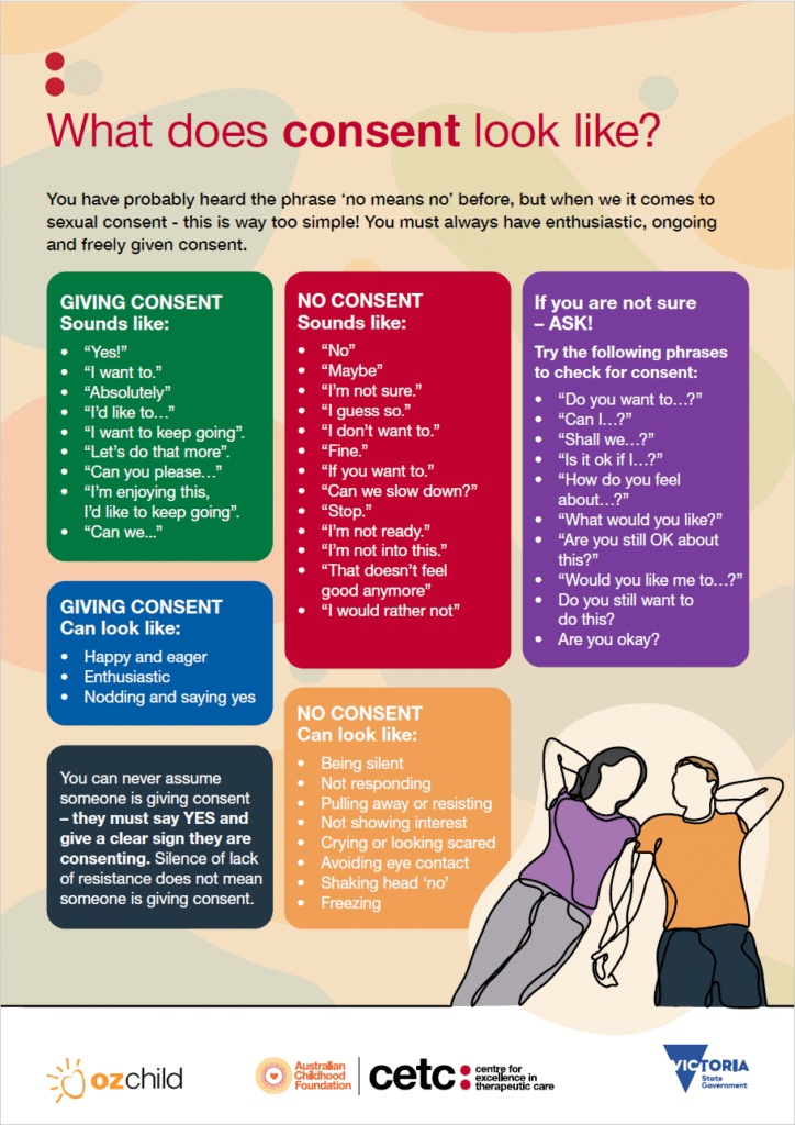 Our online course, When Yes Means YES: A carer’s guide to conversations about consent with young people has this year been piloted with OzChild foster carers. We would like to thank all the carers who participated in the pilot, taking the time in their busy weeks to do the course and generously provide us feedback. We would also like to thank the young people who were involved in the early development of the activities and engagement strategies.